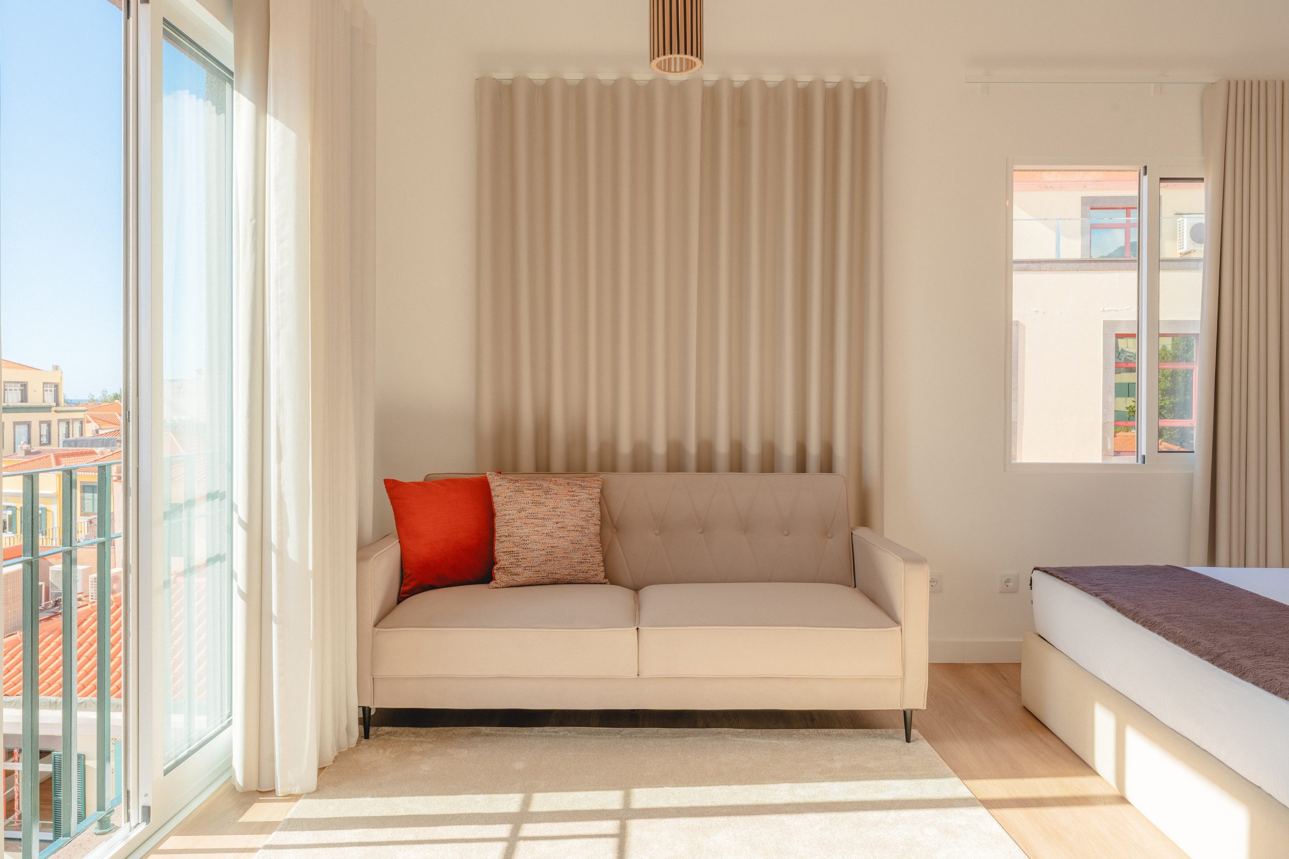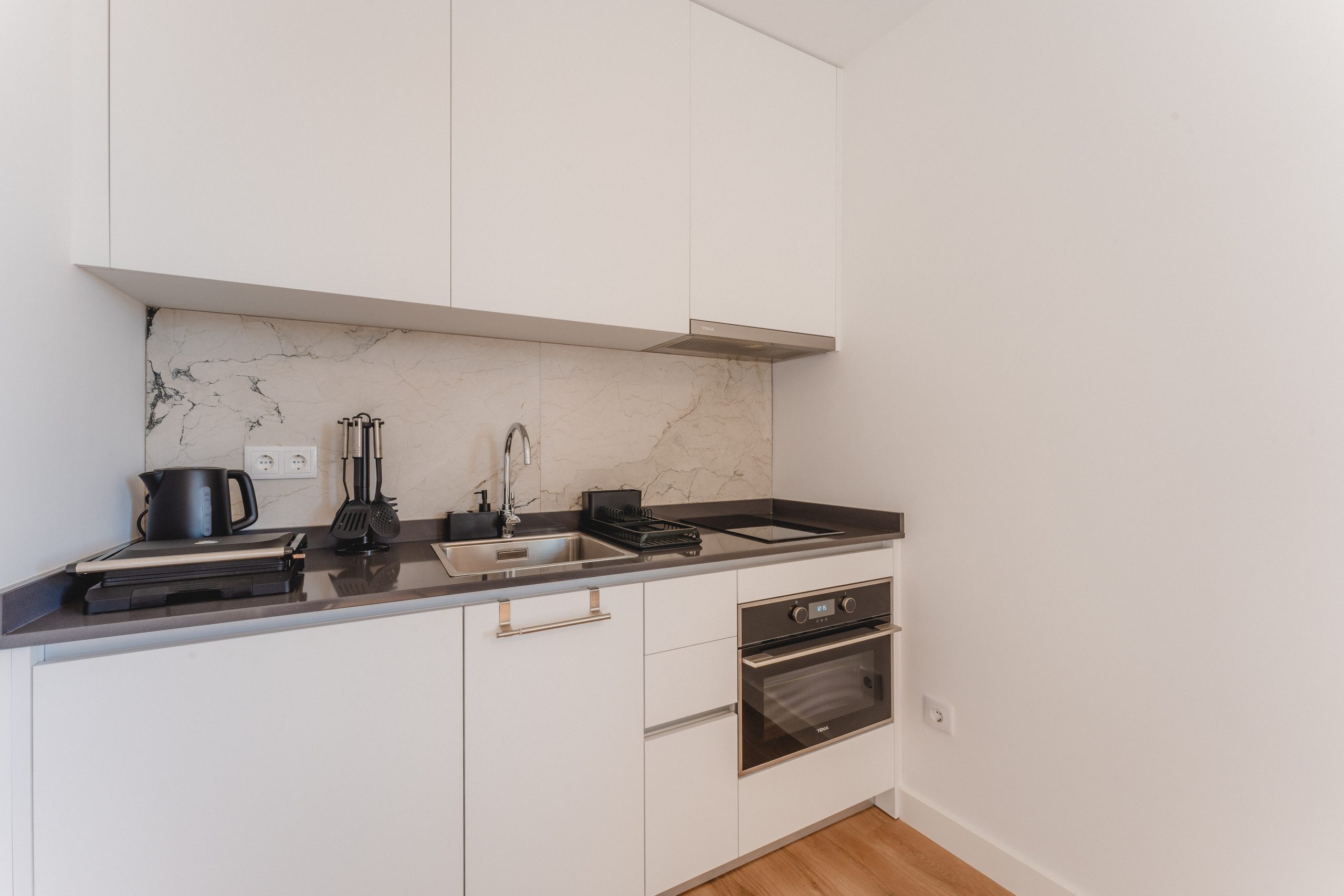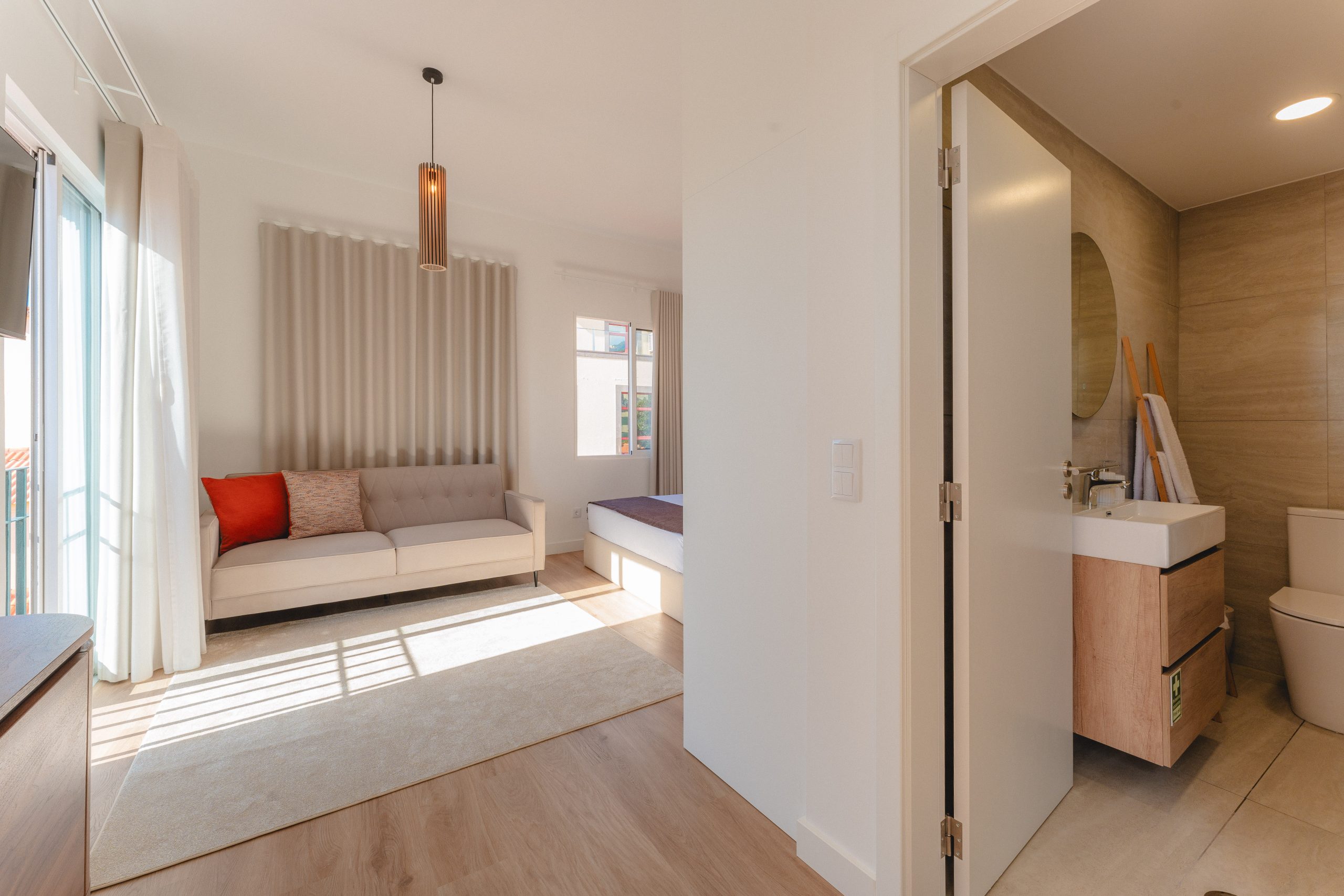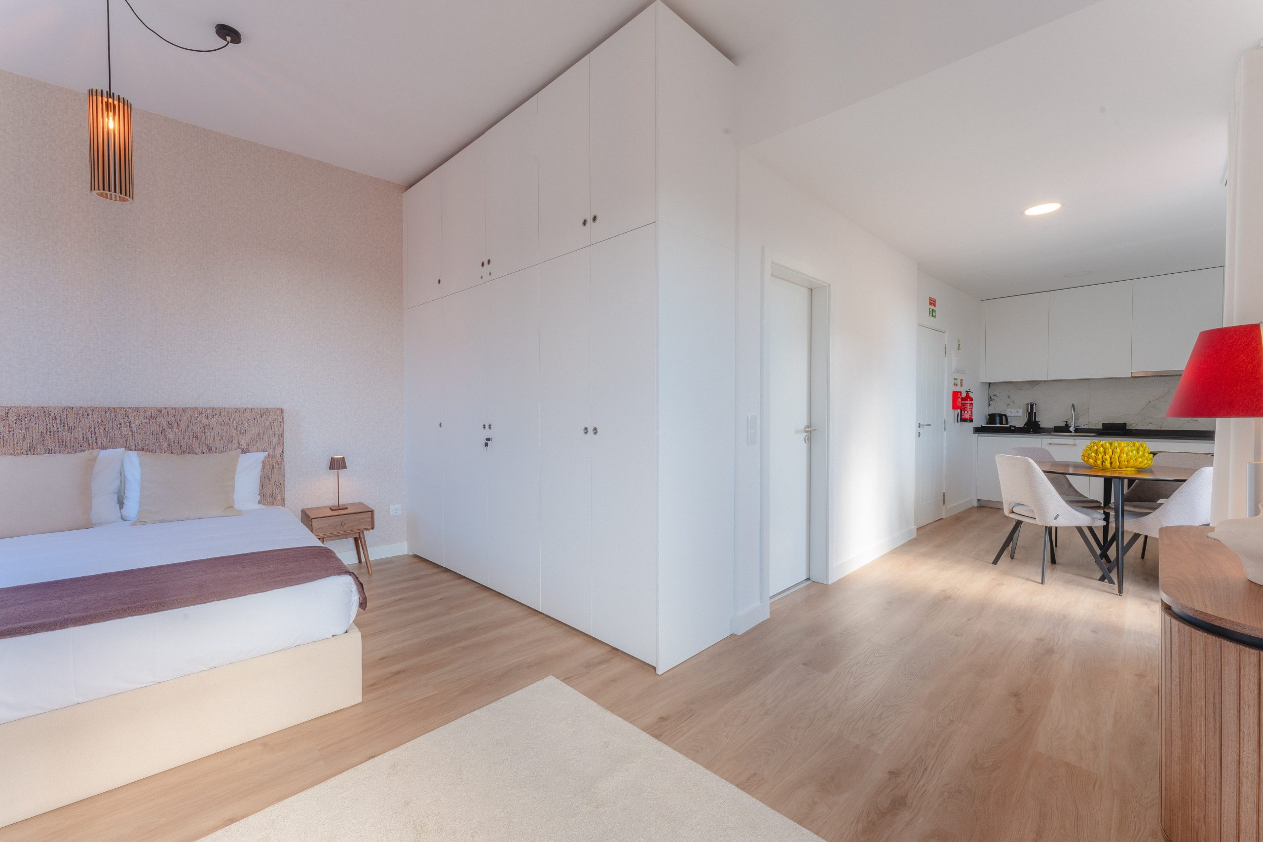 O apartamento é open space, inclui um quarto com cama de casal, um sofá-cama confortável, uma acolhedora zona de refeições e uma cozinha totalmente equipada, com frigorífico, forno, micro-ondas, placa de indução, máquina de café, chaleira elétrica e torradeira, permitindo preparar refeições com toda a comodidade.